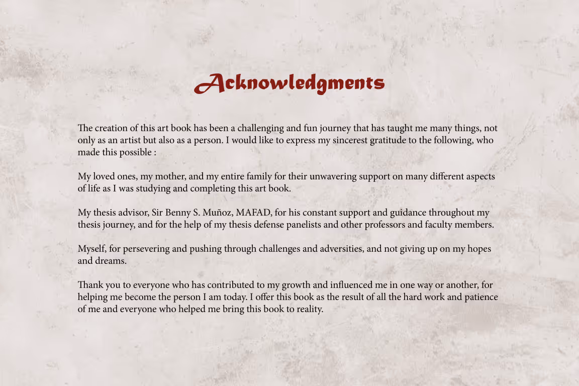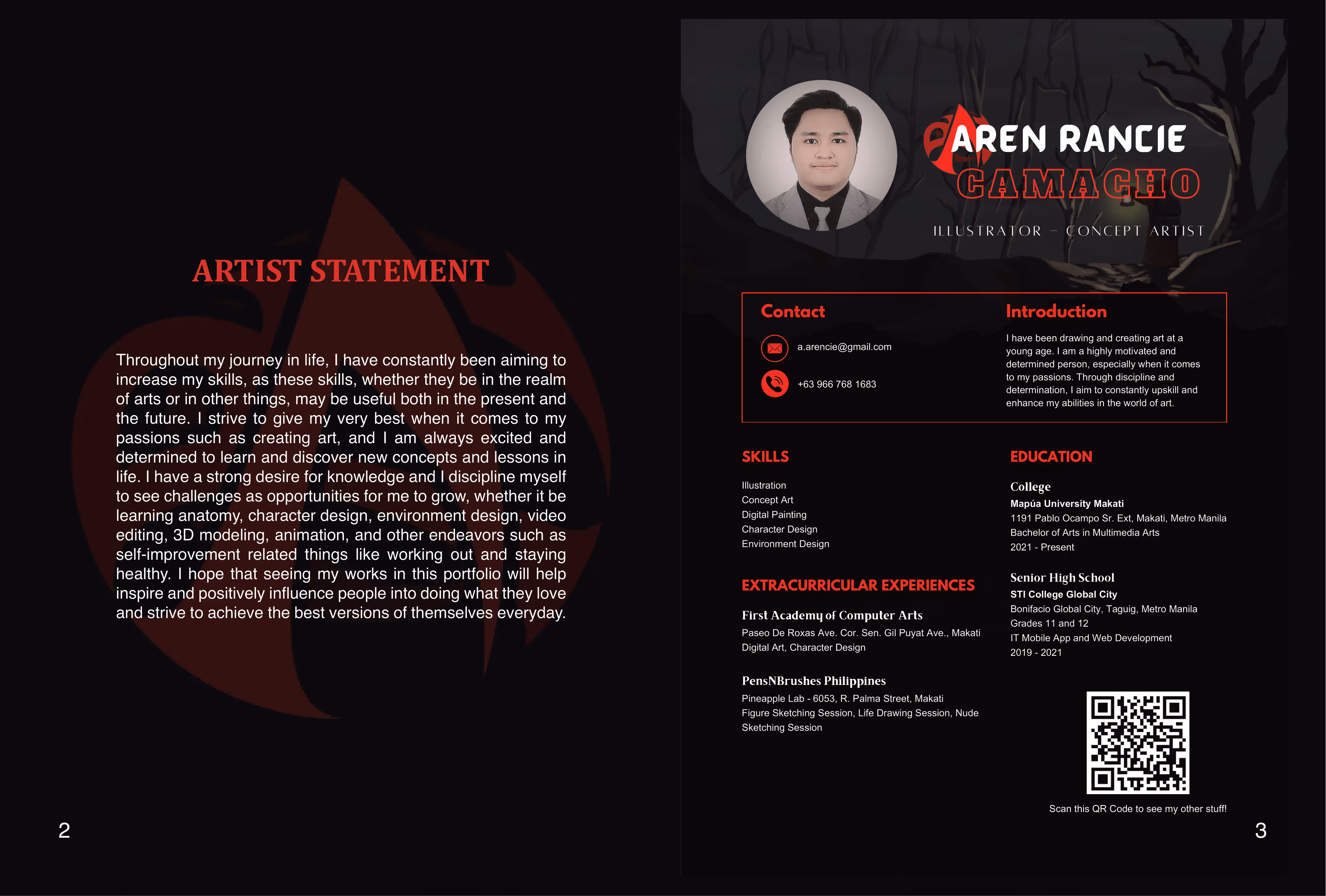 I am an artist who finds joy in creating art and strives to bring ideas to life through illustrations, concept art, and digital painting. To accomplish this goal, I aim to constantly learn new skills and techniques and hopefully light the flames of inspiration, discipline, and curiosity in others, just like how art influenced me on my journey in life.